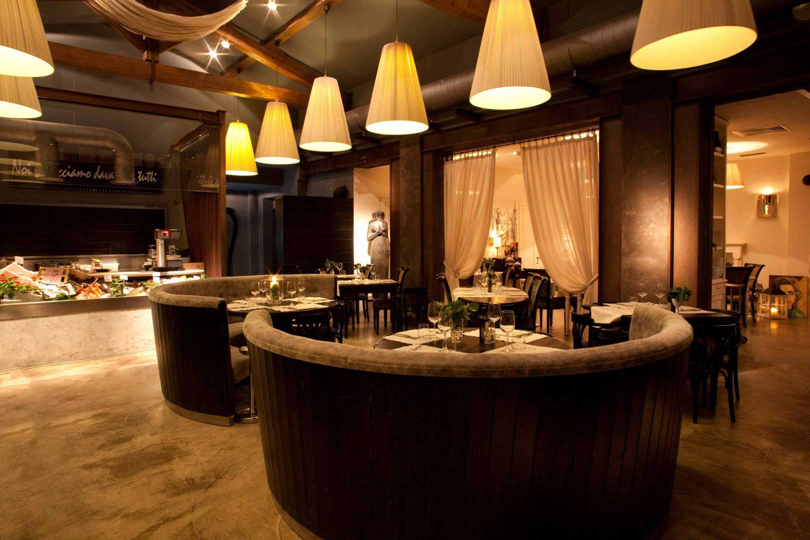 A new and original way to go to the restaurant and to taste one of the best fish menus in town. The guests of Cestello Ristoclub are welcome in the lounge area, with its impressive and linear counter, perfect for an aperitif or a drink after dinner. Inside the restaurant there is a real fish market, where the customer can choose his favourite species ,buy it and then he can also decide on the specific cooking recipe.