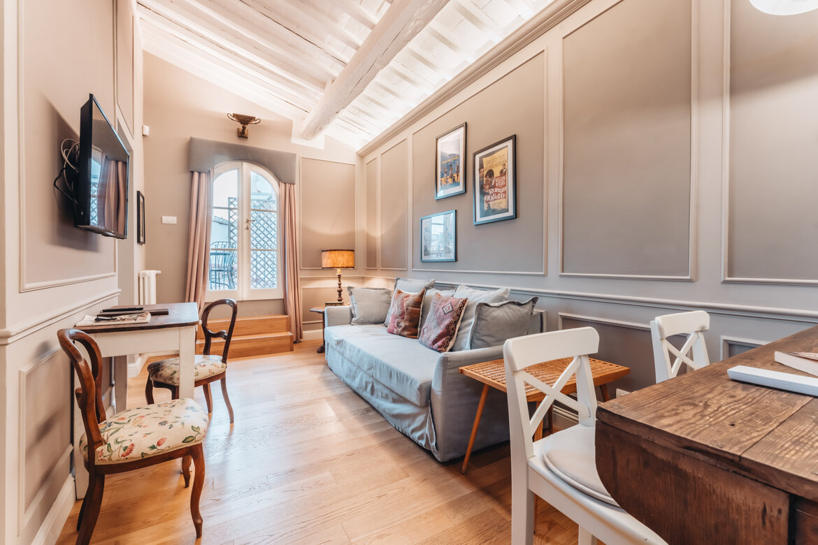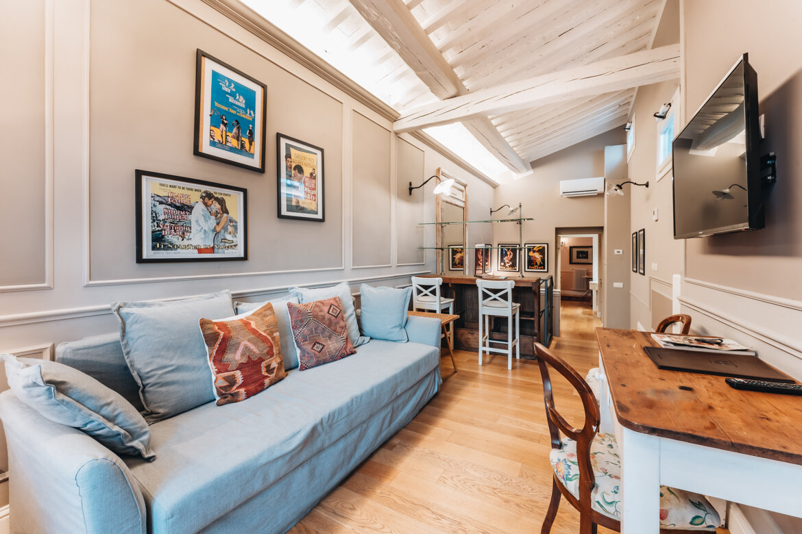 a living area with a desk and a double sofa bed, a fully equipped kitchen and a beautiful terrace