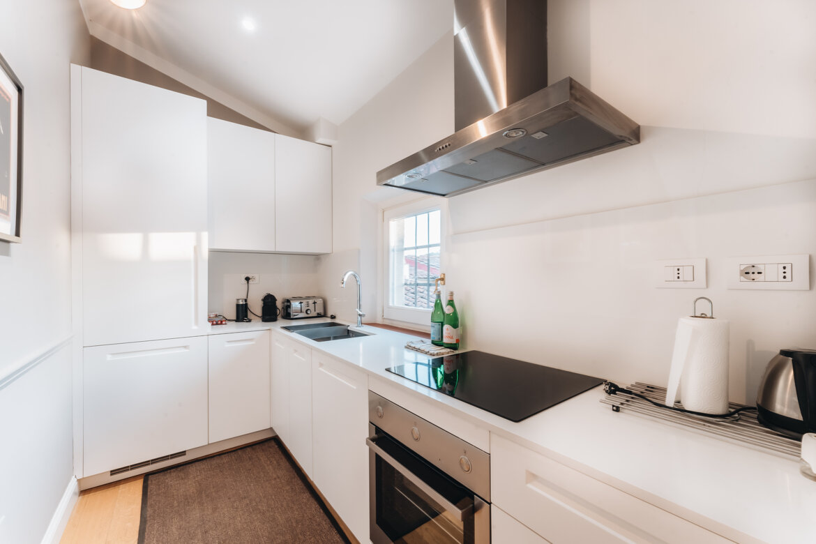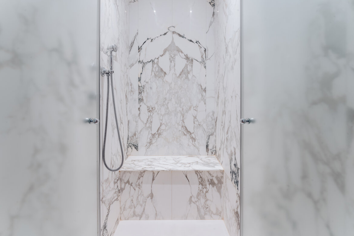 The 60 square meter apartment has a double bedroom, a full bathroom, a large Carrara marble shower,